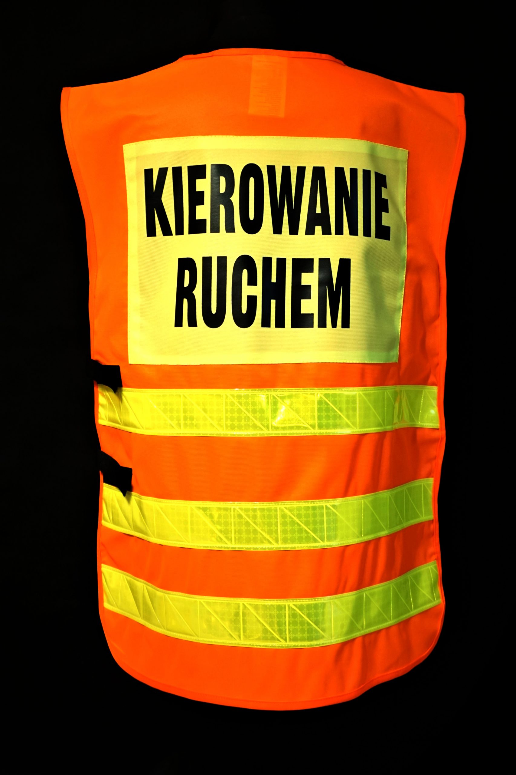 Narzutka ostrzegawcza kierowanie ruchem to obowiązkowy ubiór dla osób wydających polecenia i sygnały w zakresie kierowania ruchem drogowym.Wykonana z dzianiny poliestrowej w kolorze fluorescencyjnym pomarańczowym. Z przodu i tyłu narzutki naszyte są trzy pasy certyfikowanej taśmy odblaskowej pryzmatycznej. Taśma w kolorze fluorescencyjnym żółtym o szerokości 50 mm każdy pas. Rozmieszczenie pasów – jeden pas umieszczony bezpośrednio pod napisem oraz dwa pasy w dolnej części narzutki. Po obu stronach narzutki w górnej części naszyte napisy KIEROWANIE RUCHEM w kolorze czarnym na żółtym fluorescencyjnym tle. Dzięki czemu narzutka zwiększa widoczność na drodze przez co poprawia bezpieczeństwo.